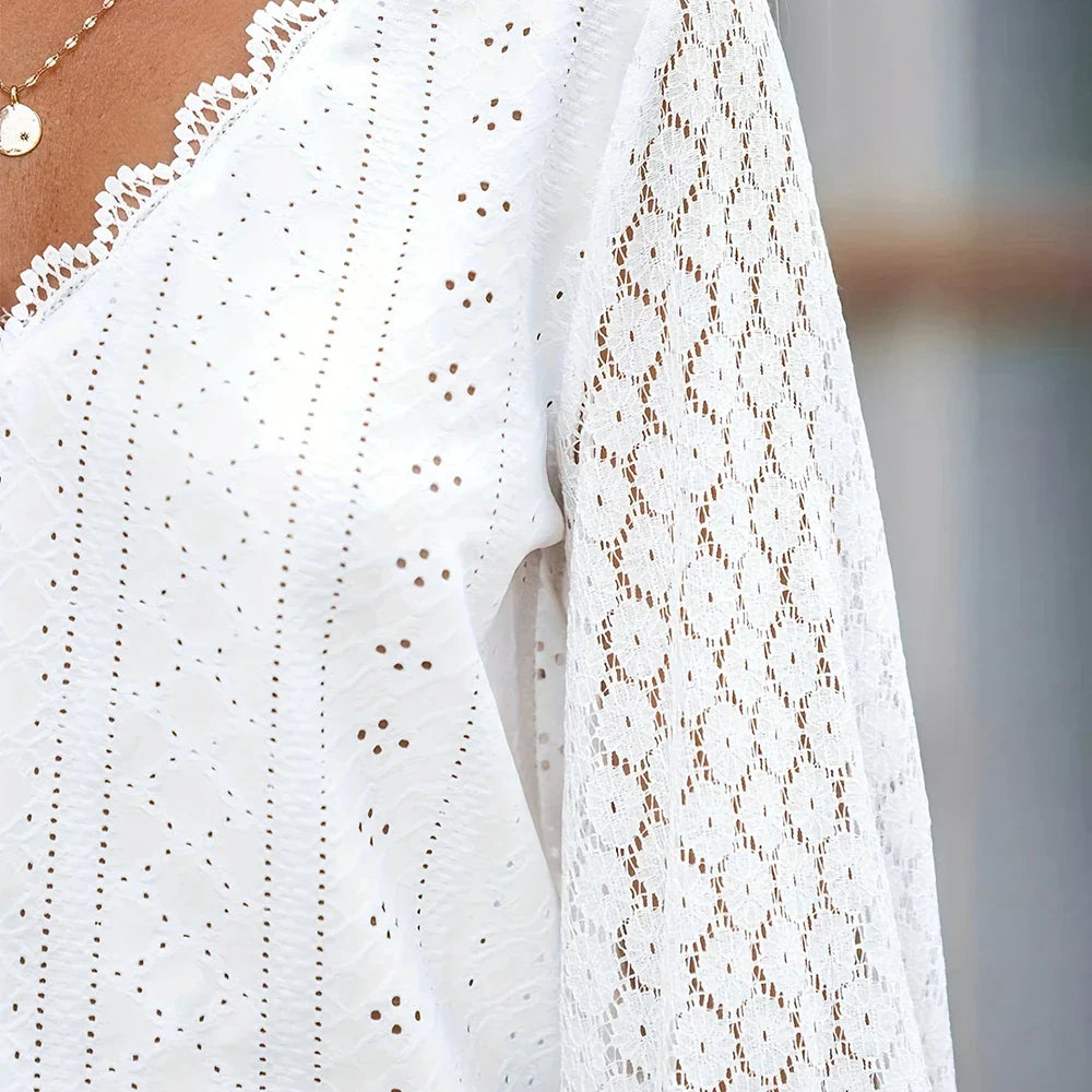 With its elegant V-neckline and beautiful lace details, this blouse is a perfect addition to your wardrobe. The long, puffy sleeves with lace patterns give a romantic and feminine touch, while the light, airy fabric makes it ideal for warm days.
