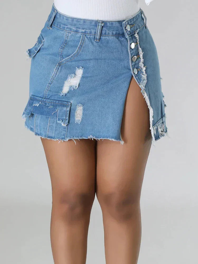 - Detalles deshilachados y un lavado especial: le dan a la falda un toque informal pero sofisticado y la convierten en una prenda que llama la atención.