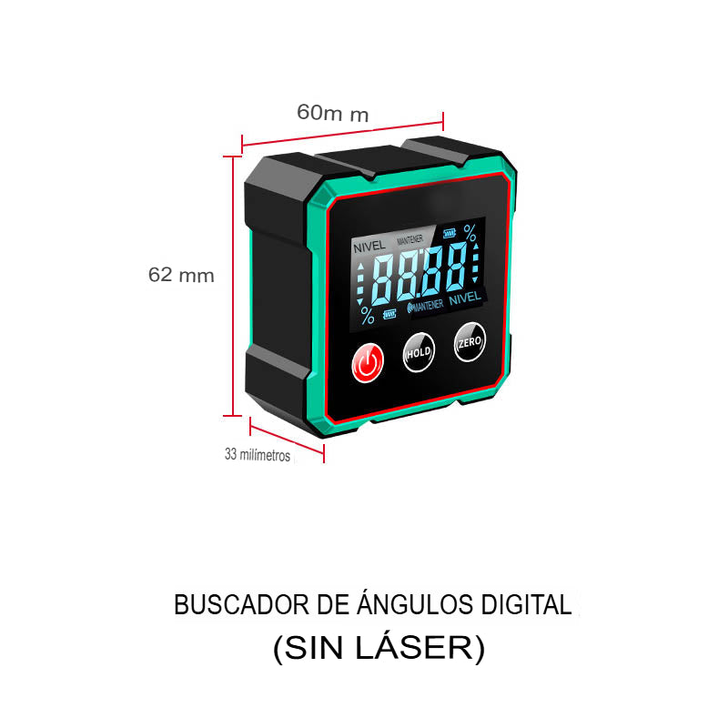 Función dual: nivel y medidor de ángulo:  Esta versátil herramienta combina un nivel de precisión y un medidor de ángulo digital en un dispositivo compacto, lo que te permite medir posiciones horizontales, verticales y angulares con una precisión excepcional para una amplia variedad de proyectos.